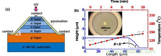 圖1:(a)4H-SiC APD的示意性橫截面結構;(b)光刻膠回流技術的溫度變化和800μm直徑4H-SiC APD的斜面臺面和(插圖)頂視圖照片。