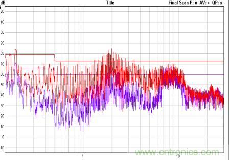 當(dāng)綜合上述所有措施后,EMI總效果對比如圖所示: