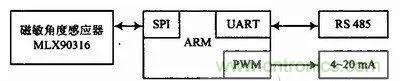 數(shù)據(jù)處理單元由磁敏角度感應(yīng)器、微處理器單元、通信接口以及輸出模塊,具體的功能框如圖2所示。