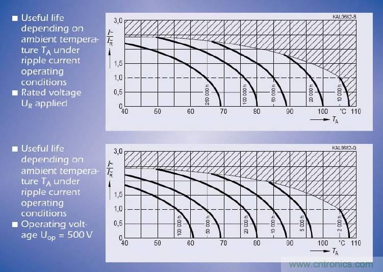 EPCOS的B43550規(guī)格的鋁電解電容器壽命與溫度、紋波電流的關(guān)系