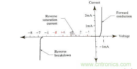 在通常情況下,反向偏置的PN結(jié)中只有一個(gè)很小的電流。這個(gè)漏電流一直保持一個(gè)常數(shù),直到反向電壓超過某個(gè)特定的值,超過這個(gè)值之后PN結(jié)突然開始有大電流導(dǎo)通(圖1)。這個(gè)突然的意義重大的反向?qū)ň褪欠聪驌舸?,如果沒有一些外在的措施來限制電流的話,它可能導(dǎo)致器件的損壞。