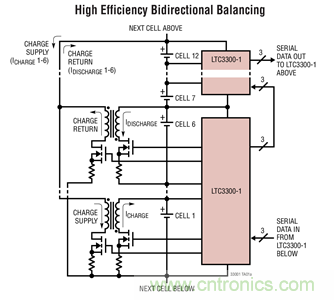 LTC3300是一款獨(dú)立的雙向反激式控制器,適用于鋰電池和LiFePO4電池,可提供高達(dá)10A的均衡電流。由于控制是雙向的,任意電池單元中的電荷都能高效率的與12節(jié)甚至更多串聯(lián)電池單元進(jìn)行來回傳輸。單個(gè)LTC3300最多可以均衡六個(gè)電池單元。
