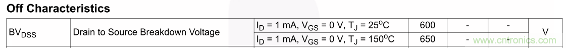 漏源擊穿電壓BVDSS是功率MOSFET數(shù)據(jù)表中所標(biāo)稱的最小值。如下圖所示: