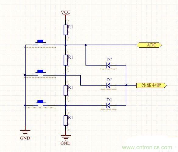 改進二:在原有的ADC按鍵的基礎(chǔ)上,也可用增加二極管的方式,實現(xiàn)按鍵中斷,并在中斷服務(wù)程序里進行AD轉(zhuǎn)換,從而識別按鍵。電路如圖1.6所示。