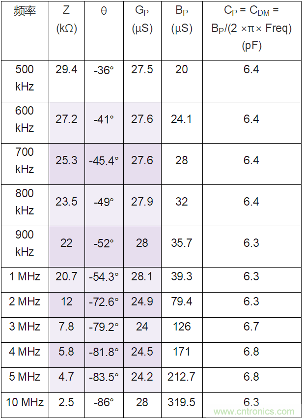 同時,雙極性輸入運算放大器幾乎與其FET同類產(chǎn)品一樣簡單。但是,由于它們與CDM電流并聯(lián),因此它們的高輸入偏置電流和電流噪聲較為明顯。此外,雙極性差分對輸入內(nèi)在的固有差分電阻RDM也與CDM并聯(lián)。表3以低噪聲精密放大器ADA4004為例,顯示了其阻抗測量。顯然,相位并不表示純?nèi)菪孕袨?,因為它遠離-90°。盡管4 MHz、5 MHz和10 MHz頻率非常接近,但并聯(lián)等效阻抗RC模型將適合本例,以便能夠從其他電阻中提取出CDM。因此,表3中顯示了在一定頻率范圍內(nèi)的并聯(lián)電導GP、電納BP和CDM的計算值,其中假定CP等于CDM。