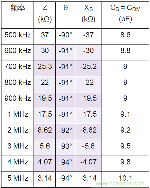 Most JFET and CMOS input op amps were measurable using this new CDM measurement使用這種新的CDM測量技術,可以測量大多數(shù)JFET和CMOS輸入型運算放大器。為了說明該方法,以測量低噪聲精度JFET運算放大器LT1792為例。下表列出了在一定頻率范圍內(nèi)的阻抗(Z)、相位角(θ)、電抗XS和CDM的計算值。當相位角為-90°時,阻抗表現(xiàn)為純?nèi)菪浴?/div>