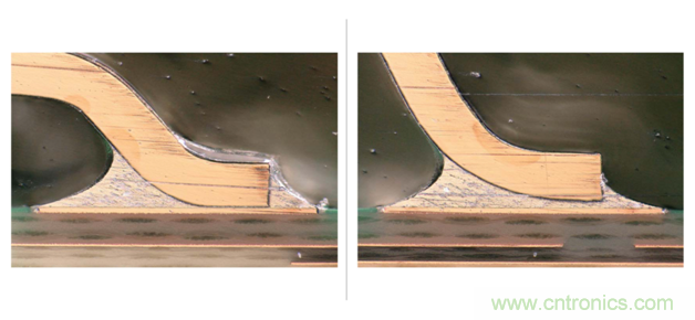 圖3 :共面度為0.152 mm的FTSH連接器樣品在使用了厚度為0.10 mm的、具有優(yōu)化開孔的焊膏模板后形成的焊接結(jié)果,可以看到其內(nèi)排(左圖)引腳和外排引腳(右圖)都是高質(zhì)量的焊點(diǎn)。(圖片來(lái)源:Samtec Inc)