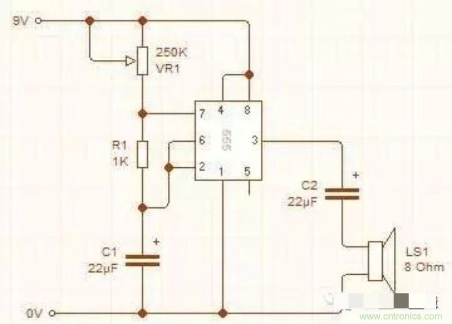 這個(gè)電路能產(chǎn)生10種不同的音調(diào),調(diào)節(jié)管腳5上的電壓可以控制音量。