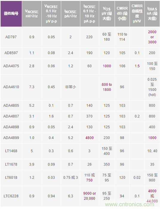 表2顯示了一些建議的接近ppm線性度的放大器的重要規(guī)格。紅色條目旨在提示讀者:該參數(shù)可能不符合ppm級失真。該組當中最易于使用的更好的產(chǎn)品為 AD8597, ADA4807, ADA4898, LT1468, LT1678, 和LT6018。