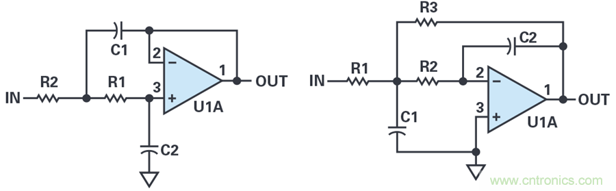 圖8. 非反相(左)和反相(右)Sallen-Key有源濾波器。