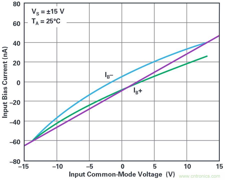 失調(diào)電壓(VOS) )將歸入此處的CMRR。斬波放大器的輸入失調(diào)電壓低于10µV,相對于2Vp-p至10Vp-p的典型輸入信號,接近于單ppm誤差。甚至,最佳ADC的失調(diào)電壓通常會多達100µV。所以,10uV級的失調(diào)電壓不會對運算放大器自身造成太大的負擔;無論如何,系統(tǒng)本身會自動調(diào)零。與輸入信號的共模電平相關(guān)的是ICMRR,即輸入偏置電流及其隨電源的變化情況。斷線表明偏置電流會隨電壓變化,并且也可能不是線性變化。共有四個ICMRR, 因為兩個輸入端有獨立的偏置電流和電平相關(guān)性,并且每個輸入端隨兩種電源的變化不同。ICMRR乘以應(yīng)用電阻的阻值會增加電路的整體失調(diào)電壓。圖4顯示了LT1468的偏置電流與VCM( ICMR規(guī)格)。添加的線所示的斜率為~8nA/V,在使用1kμΩ 應(yīng)用電阻或低ppm誤差的情況下將為8µV/V。它與直線的偏差約為15nA,由此在1kμΩ應(yīng)用環(huán)境下會在26V范圍內(nèi)產(chǎn)生15µV的誤差,或非線性度達0.6ppm。