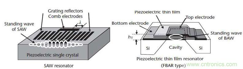 LTCC的顯著優(yōu)點(diǎn)之一是其一致性好、精度高,成本低,缺點(diǎn)是Q值較小;SAW又分為普通SAW濾波器和TC-SAW(溫補(bǔ))濾波器。如下圖一為SAW&BAW的結(jié)構(gòu)。SAW濾波器是由壓電材料和兩個(gè)基本的IDT金屬電極構(gòu)成,由圖可看出其不適合大約2.5G 以上頻率、對(duì)溫度變化敏感,但是優(yōu)點(diǎn)是技術(shù)相比較而言比較成熟,相對(duì)于 BAW價(jià)格較低。BAW濾波器又分為SMR和FBAR兩種技術(shù)的濾波器;其中FBAR工藝結(jié)構(gòu)如下圖,由上下電極及壓電薄膜構(gòu)成,通過(guò)頻率公式F=V/R可知,BAW工藝的濾波器更適合2GHZ-2.5GHZ以上的頻率,且有體積小,插損小,受溫度影響小等優(yōu)點(diǎn),當(dāng)然相對(duì)的缺點(diǎn)就是價(jià)格較SAW比較高一些。