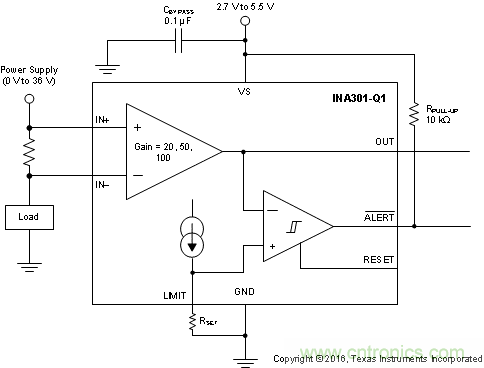 INA301具有片上精密電流源,僅需一個(gè)外部電阻即可設(shè)置閾值。此外,警報(bào)輸出的總響應(yīng)時(shí)間小于1μs。