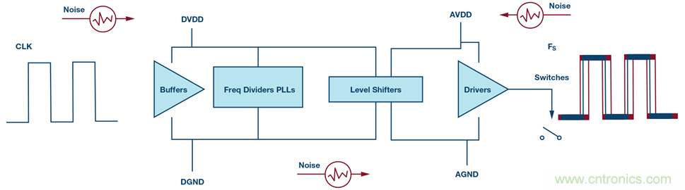 數(shù)字時鐘可以在將邊沿傳送到采樣開關(guān)之前,通過各種緩沖器和/或電平移位器在ADC內(nèi)部路由。如果ADC具有模擬電源引腳,采用的電平移位器將成為抖動源。通常,芯片的模擬端將具有高電壓器件,并具有更長的壓擺時間,因此抖動靈敏度會提高。一些設(shè)計精良的器件在板上分離更多的模擬電源給時鐘和線性電路。