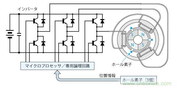 (2)代替由于換向器位置的變化而使用電刷進(jìn)行通電切換,使用霍爾開關(guān)來檢測(cè)轉(zhuǎn)子位置信號(hào)并反饋到逆變器以控制通電。