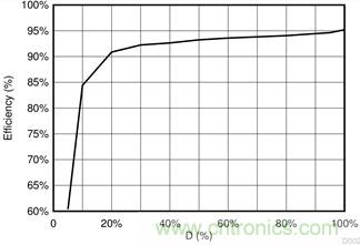 圖5表示了效率和PWM的占空比的變化曲線。測試的輸入電壓為3.6V。從曲線中可以看出,系統(tǒng)的整機效率為95%在滿載輸出功率下(5V/12.5W)。