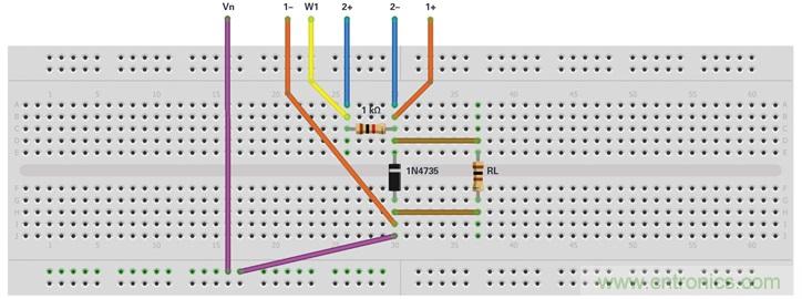 使用1N4735 6.2 V齊納二極管在無焊面包板上構建圖1所示電路。使用AWG1(5 V恒定)和–5 V Vn用戶電源作為直流電源VIN。RL使用各種固定和可變電阻。
