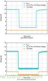 圖9比較了采用LT8672和采用傳統(tǒng)二極管的1.8 V電源。降壓型穩(wěn) 壓器工作電壓低至3 V。如圖所示,采用傳統(tǒng)二極管時,當電 池電壓 VBATT 降至3.2 V時,降壓穩(wěn)壓器的 VIN降至2.7 V左右,原因是 二極管的高壓降觸發(fā)下游開關(guān)穩(wěn)壓器UVLO關(guān)斷,其1.8 V輸出崩 潰。相比之下,LT8672輸出電壓在冷啟動期間幾乎保持恒定, 下游降壓穩(wěn)壓器能夠保持1.8 V輸出。