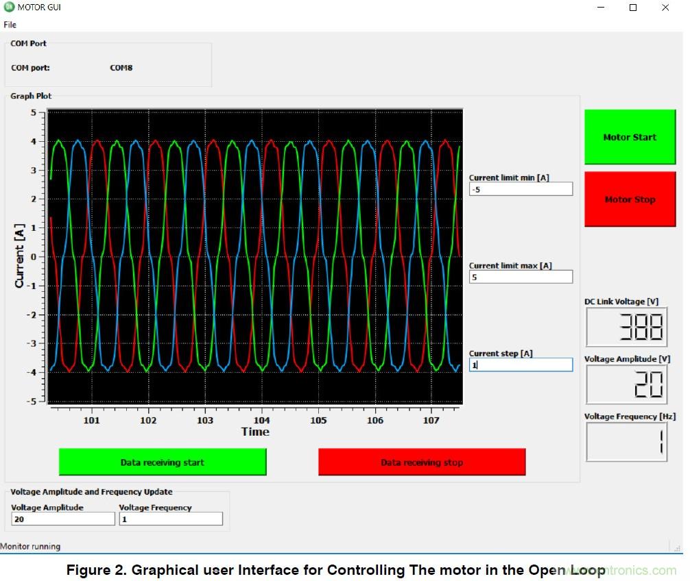 1個(gè)兼容Arduino Due的標(biāo)頭是用戶向逆變器提供脈寬調(diào)制(PWM)信號(hào)并接收檢測(cè)和故障信息的接口。如果使用Arduino Due,則在開(kāi)環(huán)中可使用空間矢量調(diào)制的簡(jiǎn)單代碼對(duì)電機(jī)進(jìn)行V/f控制。它支持通過(guò)圖形用戶接口(GUI)設(shè)置相壓幅值和頻率。