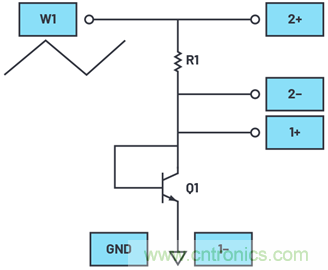 波形發(fā)生器配置為100 Hz三角波,峰峰值幅度為4 V,偏移為2 V。示波器通道單端輸入2+用于測量晶體管兩端的電壓。其設(shè)置應(yīng)配置為通道1+連接發(fā)生器W1以顯示輸出,通道2+連接Q1的集電極。流過晶體管的電流是示波器輸入1+和示波器輸入2+測得的W1兩端的電壓差除以電阻值(1 kΩ)的結(jié)果。