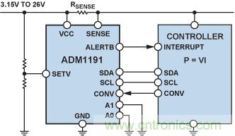 ADM1191通過I2C 總線與主控制器通信。通過配置A0和A1引腳的邏輯輸入電平,同一系統(tǒng)最多可以支持16個(gè)器件的尋址。本地控制器可以將測(cè)得的電壓與電流相乘,從而計(jì)算電源軌的功耗。發(fā)生過流狀況時(shí),ALERTB信號(hào)通過一個(gè)中斷快速通知控制器,這個(gè)關(guān)于故障狀況的快速報(bào)警可以幫助保護(hù)系統(tǒng)免遭損壞。