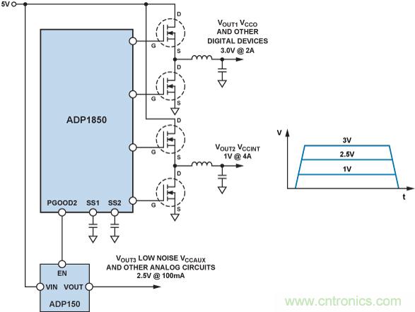 針對(duì)此應(yīng)用,利用雙通道降壓控制器ADP1850 提供1 V和3 V高電流電源是一個(gè)很好的解決方案。ADP1850具有許多特性,其中包括:軟啟動(dòng)控制、同步跟蹤以及主從電源時(shí)序控制。上電時(shí)的上升速率由SS1和SS2引腳上的電容控制。本例中,3 V數(shù)字電源是主電源。針對(duì)2.5 V模擬電源,超低噪聲 低壓差調(diào)節(jié)器(LDO)ADP150 是絕佳選擇,它可以利用ADP1850的PGOOD2信號(hào)進(jìn)行時(shí)序控制。圖2為該系統(tǒng)的簡(jiǎn)化框圖,顯示了時(shí)序控制的一般流程,詳情參見ADP1850數(shù)據(jù)手冊(cè)。