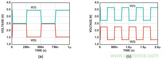 為了避免方波輸出信號失真,應(yīng)選用盡可能大的C1 和C2 使輸入信號頻率達到10倍的最差截止頻率,其中R2||RL為最小值。例如,假設(shè)不存在輸出(DUT)負載效應(yīng),為使VCANH和VCANL信號達到圖3(a)所示的電平,R2必須達到700 Ω的最小值。0.1 µF或1 µF的耦合電容可處理1 MHz的信號。圖3(b)顯示了R2調(diào)整差分輸出電平的過程。