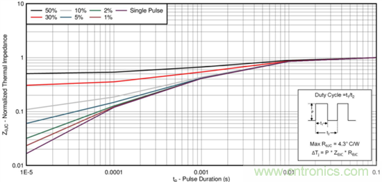 產(chǎn)品說明書首頁上出現(xiàn)的脈沖電流額定值(IDM)與連續(xù)電流額定值很相似,因為它是一個理論上的計算值。然而,與連續(xù)電流額定值不同的是,IDM只是作為熱約束條件(從正在標準化的RθJC到給定的脈沖持續(xù)時間以及“絕對最大額定值”表的腳注中明確規(guī)定的占空比)的函數(shù)被計算出來的。
