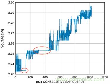 設(shè)計不佳的基準(zhǔn)電壓源電路可能導(dǎo)致嚴(yán)重的轉(zhuǎn)換錯誤。最常見的基準(zhǔn)電壓源問題是來自ADC的重復(fù)或"粘連"代碼問題。當(dāng)基準(zhǔn)電壓源輸入端噪聲足夠大,便可能造成ADC作出錯誤的位判斷。哪怕輸入有所改變,它也以同樣的代碼重復(fù)出現(xiàn)多次,或者在較低的有效位中填充重復(fù)的1或0字串,如圖9所示。紅色圓圈區(qū)域中,ADC出現(xiàn)粘連,重復(fù)返回相同的代碼。通常滿量程附近的問題更嚴(yán)重,因?yàn)榛鶞?zhǔn)電壓源噪聲對較高有效位的判斷產(chǎn)生的影響更大。一旦作出錯誤的位判斷,其余位便填充1或0。