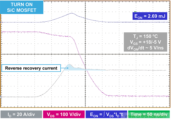 圖1和圖2分別為50 A-600 VDC狀況下,碳化硅MOSFET和硅基IGBT在開啟狀態(tài)下的換流情形。請看藍(lán)色條紋區(qū)塊,碳化硅MOSFET的反向恢復(fù)電流和反向恢復(fù)時間都減少很多。開啟和關(guān)閉期間的換流速度加快可減少開關(guān)時的電源耗損,但開關(guān)換流的速度還是有一些限制,因為可能造成電磁干擾、電壓尖峰和振盪問題惡化。