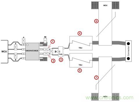 通過使用MOV(圖中第6、7)將電流導(dǎo)至地面,圖2的設(shè)置就能實(shí)現(xiàn)浪涌保護(hù)。瞬態(tài)阻斷單元(TBU)(圖中第4、5)可限制電流進(jìn)入收發(fā)器。通過前面兩個(gè)階段的電流,還會(huì)受到TVS二極管(圖中第3)、限流電阻(R)(圖中第1、2)的進(jìn)一步限制。圖2所示的這4級(jí)保護(hù),需要在電路板上安裝共計(jì)7個(gè)額外組件。這會(huì)帶來更多麻煩,如設(shè)計(jì)和組件選擇的復(fù)雜度更高、所需的電路板空間更大、材料清單上的組件更多。