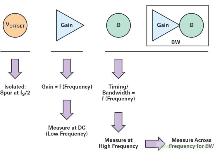 如果只是考察增益不匹配,那么它就是一個低頻(或直流)類型的不匹配。通過在直流附近執(zhí)行低頻增益測量,然后在較高的頻率處執(zhí)行增益測量,可將帶寬不匹配的增益分量與增益不匹配分離。增益不匹配與頻率無函數(shù)關系,而帶寬不匹配的增益分量與頻率呈函數(shù)關系。對于時序不匹配,可以采用類似的方法。在直流附近執(zhí)行低頻測量,然后在較高的頻率下執(zhí)行后續(xù)測量,以便將帶寬不匹配的時序分量與時序不匹配分離。