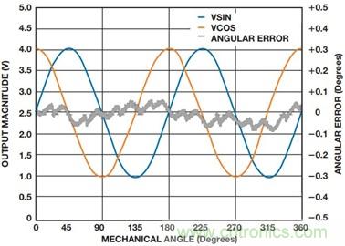 圖2顯示了旋轉(zhuǎn)磁場施加在360°機械旋轉(zhuǎn)情形時ADA4571的典型高輸出電平和角度誤差。在微控制器中進行失調(diào)校正和反正切計算之后,典型誤差小于0.1°。