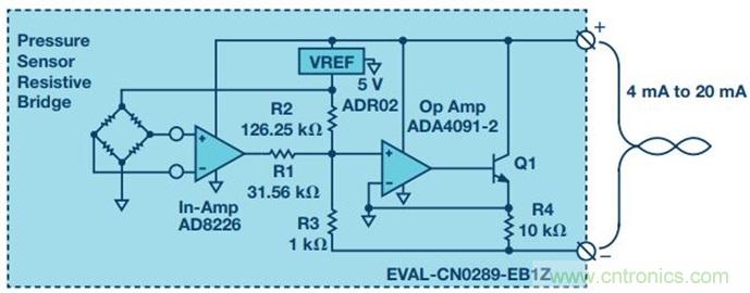 圖1. 模擬4 mA到20 mA環(huán)路供電變送器(參考CN0289)。