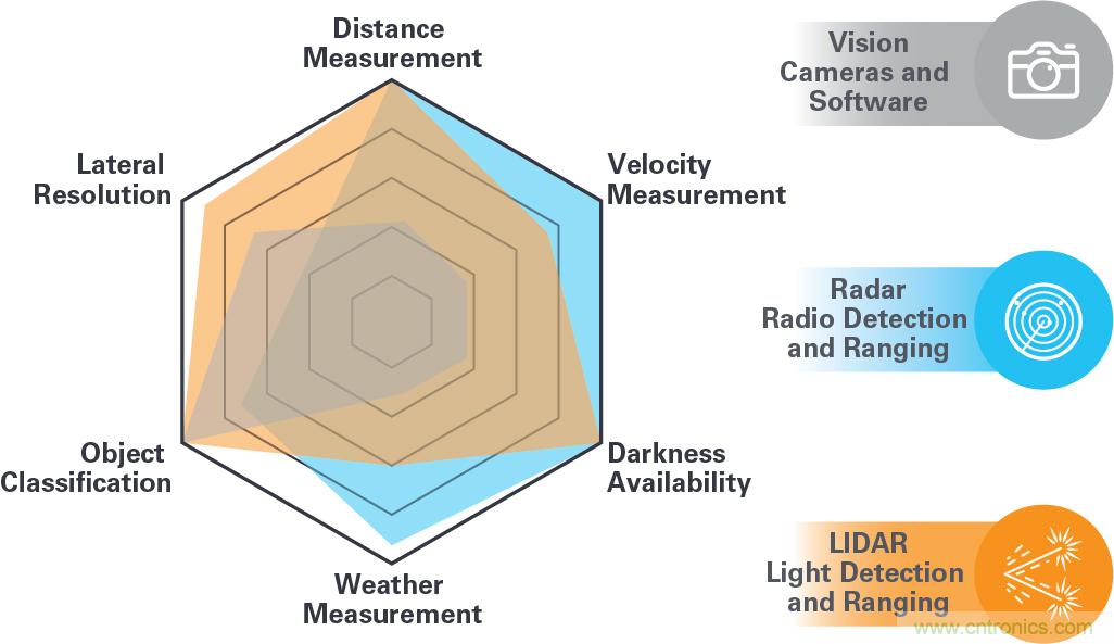 圖1.蛛網(wǎng)圖,比較視覺、雷達和LIDAR。