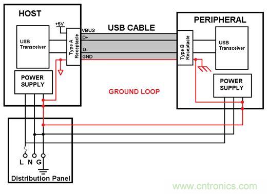 圖3: 利用USB電纜連接兩個(gè)交流電源供電的器件造成接地環(huán)路中斷總線通信