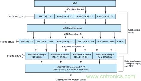 圖3. ADC應(yīng)用層可將5個(gè)12位ADC樣本重新映射到4個(gè)JESD204B N’ = 16樣本所用空間中。4位額外輔助信息可提供其他用途。