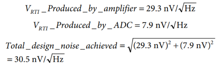 我們可算出運(yùn)算放大器輸入端的總噪聲,并確保其低于41.6 nV/√Hz,一如我們所預(yù)期的那樣。
