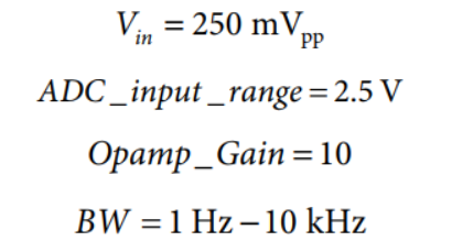 有了ADC的輸入電壓范圍將有助于我們設(shè)計增益模塊。為 了最大化動態(tài)范圍,我們需要在給定的輸入信號和ADC輸 入范圍內(nèi)選取盡可能高的增益。這意味著我們可以將該例 子中的增益模塊設(shè)計成具有10倍的增益。