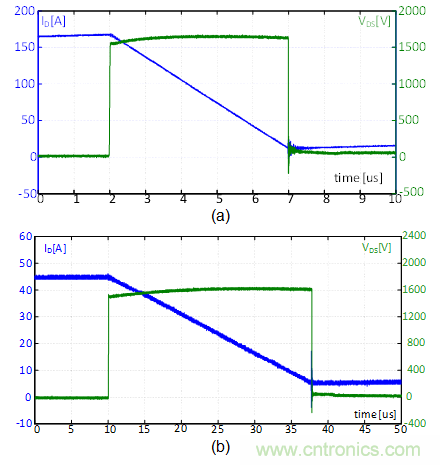 圖7(a)和(b)所示是按照測試條件B,在L=50?H 和1mH時,各做一次UIS測試的失效波形,為簡單起見,只從SiC MOSFET D3中抽取一個典型樣品做實驗。