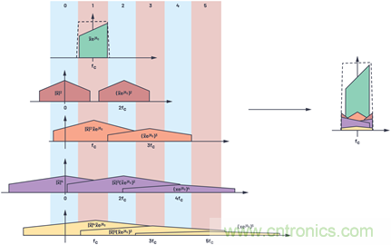 考慮到傳統(tǒng)窄帶數(shù)字預(yù)失真解決方案的處理在復(fù)雜的基帶處完成,我們主要關(guān)注對稱位于載波周圍的諧波失真。在寬帶電纜系統(tǒng)中,盡管保持了位于一次諧波周圍的那些項的對稱性,但是這一對稱性不再適用于更高階次的諧波產(chǎn)物。