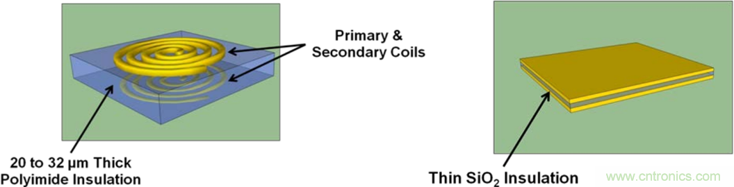 圖1. 帶厚聚酰亞胺絕緣層的變壓器,電流脈沖產(chǎn)生磁場(chǎng),在另一個(gè)線圈中感生電流(左圖); 帶薄SiO2絕緣層的電容,利用低電流電場(chǎng)將數(shù)據(jù)耦合到隔離柵的另一端(右圖)