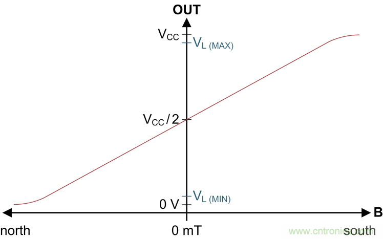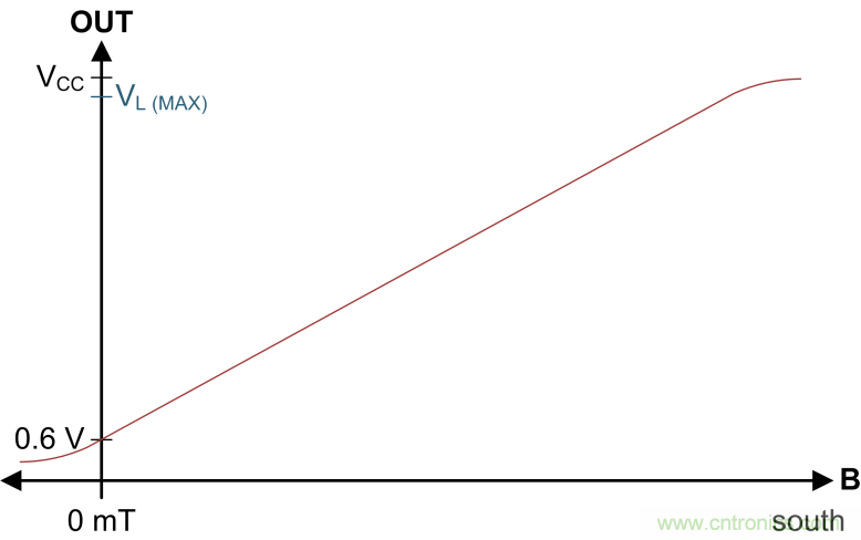 2) DRV5056只響應(yīng)南磁極,對(duì)于感應(yīng)一個(gè)磁極的應(yīng)用, 此響應(yīng)可以最大限度提高輸出動(dòng)態(tài)范圍。對(duì)于單位磁通量密度的變化輸出范圍翻倍,磁性靈敏度也會(huì)翻倍。