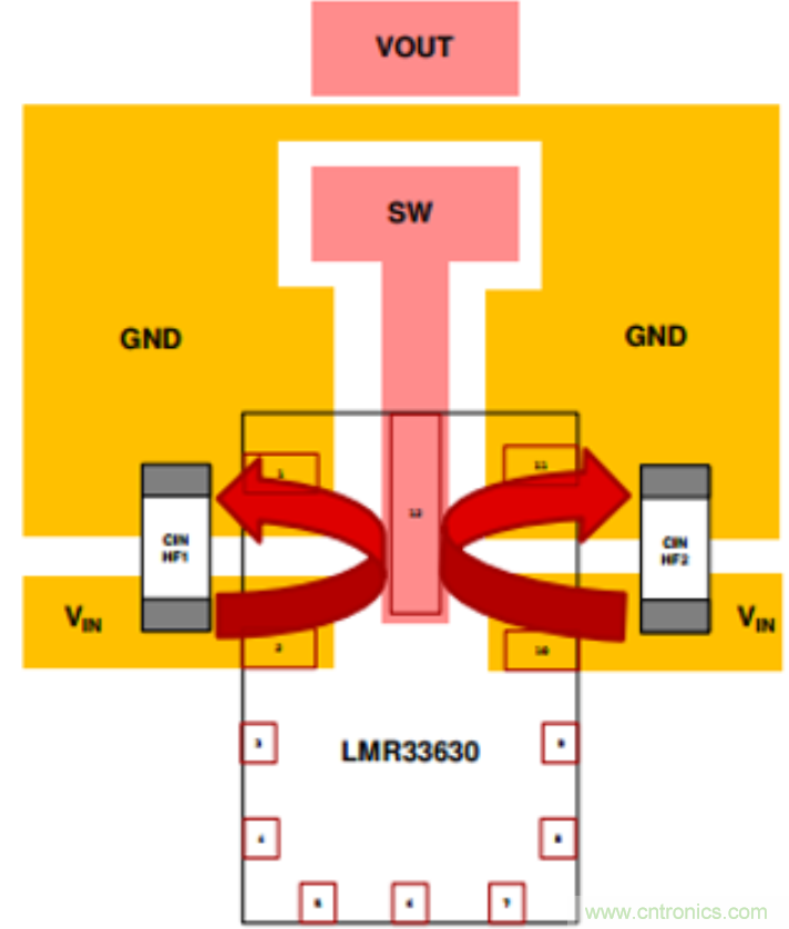 HotRod 封裝技術將芯片內部的die倒置,通過銅柱直接連接die 和lead frame,消除了使用wire bond引入的寄生電感,減小SW節(jié)點的振蕩,例如LMR33630。另外,如圖4所示,HotRod封裝有兩個電源VIN引腳和兩個接地GND引腳,分別位于封裝的兩端。這種引腳分配可以減少VIN和GND回路造成的寄生環(huán)路電感。如果在器件的兩邊都有對稱布局的輸入電容,等效寄生回路電感則會減半(兩個相等的并聯(lián)電感)。這可以有效地減少高的di/dt 產(chǎn)生的噪聲,相當于高頻濾波。