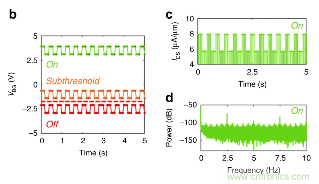 在 Stochastic resonance in MoS 2 photodetector | Nature Communications[2] 論文中,被檢測(cè)的光信號(hào)是2.5Hz的方波信號(hào)(如下圖信號(hào)b)。它所引起光傳感器輸出電流波形如下圖的C,對(duì)應(yīng)的信號(hào)頻譜如下圖的D。信號(hào)采樣頻譜為200Hz。