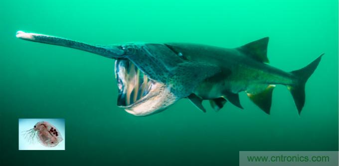 ▲ 大白鱘依靠附屬在它長(zhǎng)長(zhǎng)鼻子上的電信號(hào)感受器來(lái)捕捉浮游生物水蚤