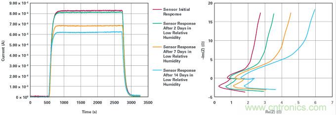 圖3.在低相對濕度下的加速壽命測試中,傳感器靈敏度(左圖)和阻抗(右圖)之間的相關(guān)性
