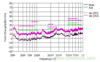 接下來是作為評估數(shù)據(jù)而公開的EMC測試結(jié)果。從測試結(jié)果可以看出,即使讓整個參考板運行,在沒有輸入濾波器的情況下,EMC輻射噪聲(天線垂直)(圖3)、輻射噪聲(天線水平)(圖4)和傳導(dǎo)噪聲(圖5)均符合CISPR25 Class5標(biāo)準(zhǔn)。在PCB上還預(yù)先預(yù)備了用于增加噪聲特性余量的輸入濾波器安裝圖案,因此還可以針對會對整個單元的改進工作具有重大影響的EMC問題采取增加輸入濾波器的措施。