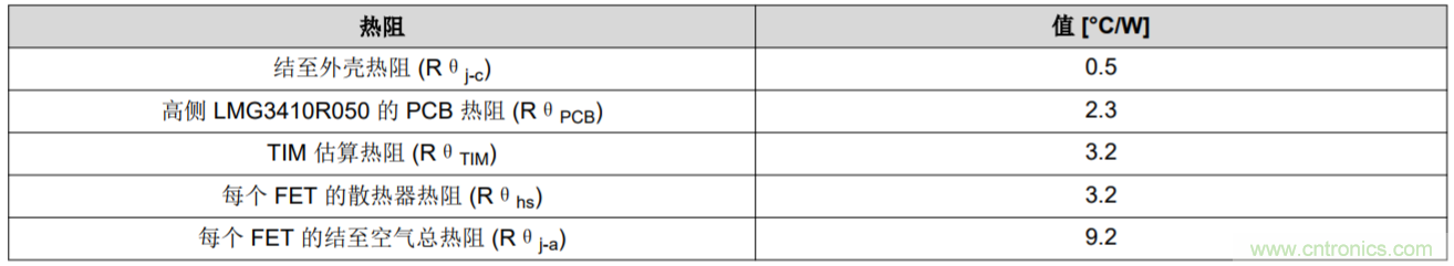 表 3-4: LMG3410R050-HB-EVM 在 400LFM 強(qiáng)制空氣冷卻下的熱阻