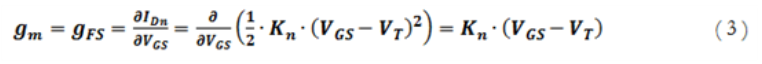 不過,它也依賴于設(shè)備的W/L比,所以在一般較大的設(shè)備中,等式1將表現(xiàn)出更為突出的線性行為。雖然大多數(shù)數(shù)據(jù)資料中不包括Kn,但它可以從一個普通的參數(shù)計算而來,這個參數(shù)是向前跨導(dǎo),往往記作gm或gFS: